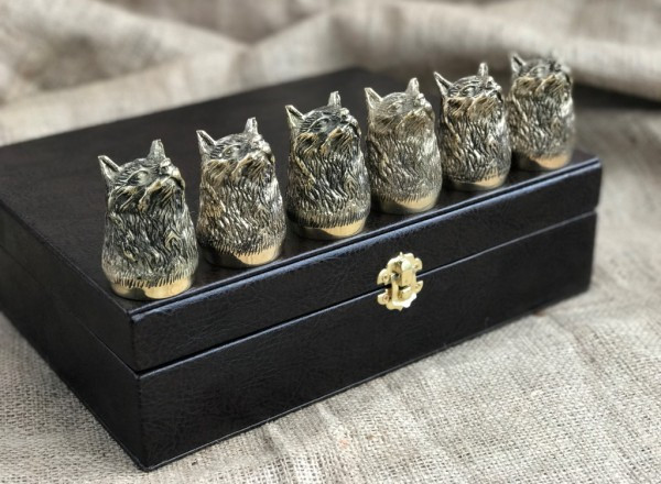 Набір бронзових чарок "Волки" — це унікальний подарунок для справжніх цінителів природи та символів сили і єдності. Кожна чарка виконана з бронзи та має витончений дизайн, що зображує могутніх вовків — символів свободи, відваги та мудрості. Деталізоване зображення цих хижаків на кожній чарці додає набору особливого характеру та естетики.